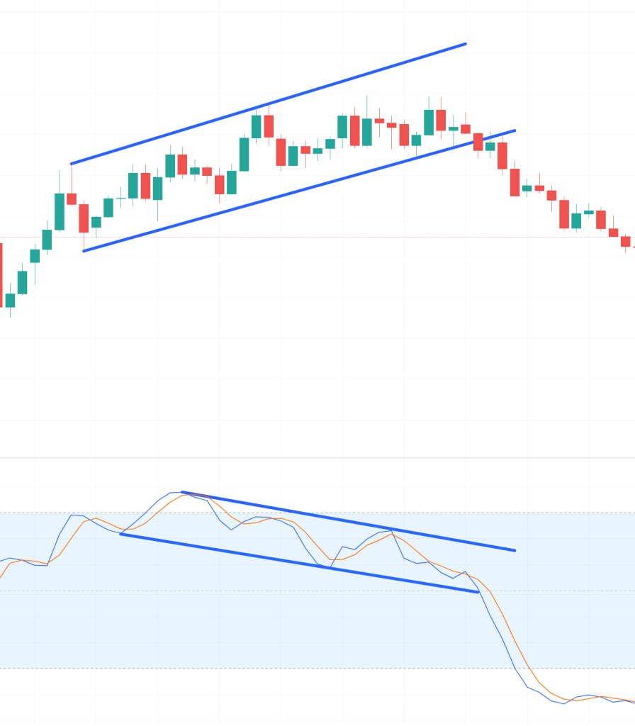 Wenn der Kurs eines Basiswerts steigt, während der stochastische Indikator fällt, kann dies darauf hindeuten, dass der Aufwärtstrend bald enden wird.